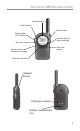 Your Oricom PMR3000 radio controls Indicator light On/off button Menu button Push to talk (PTT) button Volume up and menu settings Key lock Call tone button Volume down and menu settings Scan and monitor Headset socket Charging contacts Battery compartment clip 9