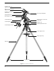 Declination lock lever (opposite side) Right ascension lock lever (opposite side) Declination slow-motion control knob Tube ring mounting plate Safety thumbscrew Mounting plate securing knob Counterweight shaft Right ascension slow-motion control knob Counterweights Latitude scale Latitude adjustment L-bolts Counterweight lock knobs Center support shaft Tripod support tray Tripod leg Leg lock knobs Figure 1. The SkyView Pro EQ Mount.