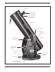 EZ Finder II Oculaire 28 mm DeepView 50.8mm Système de mise au point 50.8mm à deux vitesses Crayford Tube optique Bouton de navigation Bouton d’assemblage du tube Raquette de commande GoTo Poignée Carter du moteur d’altitude Oculaire 12,5 mm Illuminated Plössl 31.7mm Porte-oculaires Poignée Base Dobson Protection antipoussière en mousse de polyéthylène Figure 1. Vue d’ensemble du Dobson SkyQuest XTg (12" représenté).