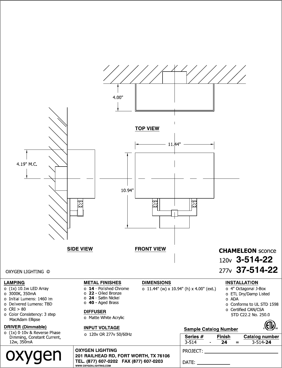 4.00" TOP VIEW 419"MC. r—i 11.44" 4-1 10.947 SIDE VIEW FRONT VIEW CHAMELEON sconce 120v 3-514-22 OXYGEN LIGHTING © 27v 37-514-22 LAMING METAL FINISHES DIMENSIONS INSTALLATION o (1x) 10.1w LED Array o 14 Polished Chrome o 11.44" (W) x 10.94" (h) x 4.00" (ext.