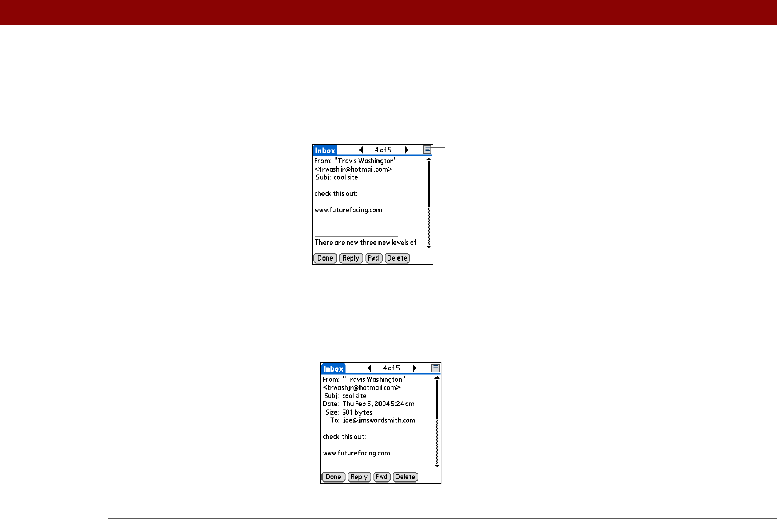 • Short header: Shows sender’s name or address (From field) and subject line (Subj field).