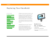 CHAPTER 1 Exploring Your Handheld Entering information Tip Write letters on the left side of the input area and numbers on the right. Uppercase letters go in the center. Did You Know? Your handheld package includes a sticker that shows the most common Graffiti 2 characters. Put the sticker on the inside of the flip cover to always have it handy. There are several ways to enter information on your handheld.