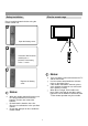 Battery installation Effective remote range Please install the batteries before using the remote control unit. Open the battery cover. 5m POWER CH VOL VOL - + CH ENTER MENU Install two "AAA" batteries matching the +/polarities of the battery to the +/- marks. C.SYS ZOOM CLK AUTO.ADJ P.M DSP SLP 1 2 3 4 5 6 7 AV STILL 9 8 -/-- 0 OSD POSITION Bass+ Treb+ Bass - Treb- Notes: There should be no obstacle between the TV and the transmitter.