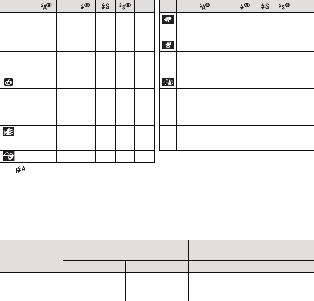 (±: Available, —: Not available, ¥: Initial setting of Scene Mode)