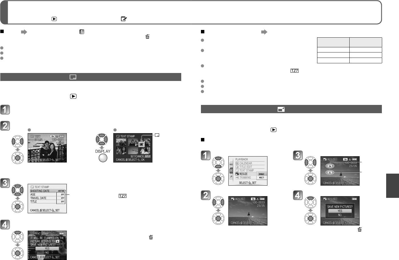 resized or trimmed, and ‘ASPECT CONV.’ , ‘TEXT STAMP’ and DPOF date printing