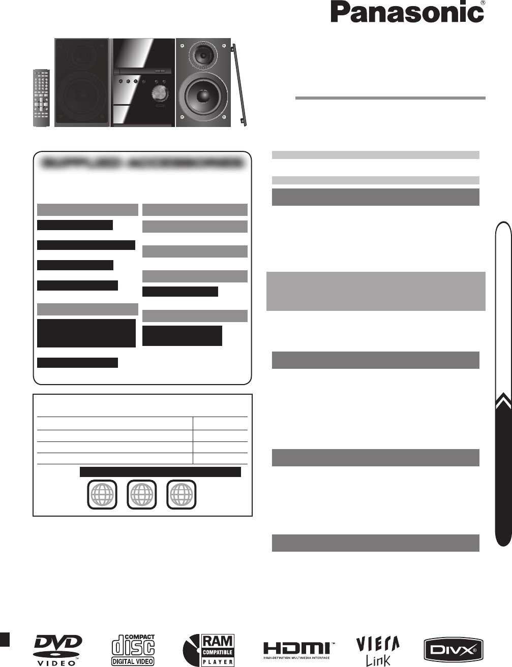 Èíñòðóêöèÿ çà óïîòðåáà DVD ñòåðåî ñèñòåìà Mîäåë: 2 x áàòåðèè çà äèñòàíöèîííî Çà Âåëèêîáðèòàíèÿ (K2CT3CA00004) Çà Êîíòèíåíòàëíà Åâðîïà (K2CQ2CA00007) Çà Àâñòðàëèÿ è Í.Ç. (K2CJ2DA00008) Çà Þãîèçòî÷íà Àçèÿ (K2CQ2CA00006) 1 x äèñòàíöèîííî 1 x ñòàéíà FM àíòåíà (RSA0007-L1) 1 x AM êðúãîâà àíòåíà (N1DAAAA00001) 1 x àíòåíåí àäàïòåð Çà Âåëèêîáðèòàíèÿ (K1YZ02000013) 1 x âèäåî êàáåë Çà Âåëèêîáðèòàíèÿ Çà Êîíòèíåíòàëíà Åâðîïà Çà Àâñòðàëèÿ è Í.Ç. Çà Þãîèçòî÷íà Àçèÿ Çà Àâñòðàëèÿ è Í.Ç.