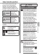 Säkerhetsföreskrifter Rör inte utomhusenheten under blixtoväder, då det kan orsaka elstöt. Sitt inte och ställ dig inte på enheten, eftersom du då kan trilla och skada dig. Installera inte inomhusenheten utomhus. Den är endast utformad för installation inomhus. Strömförsörjning Använd inte modifierad sladd, förgreningssladd, förlängningssladd eller ospecificerad sladd för att undvika överhettning och eldsvåda.
