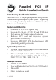 Parallel PCI 1P Quick Installation Guide Introducing the Parallel PCI 1P The Parallel PCI 1P high-speed parallel card provides one additional parallel port to your system. Depending on the model purchased, this board will fit into either Full or Low Profile chassis. Features and Benefits • • • • • Conforms to PCI v2.2 Plug and Play Supports 32-/64-bit, 3.