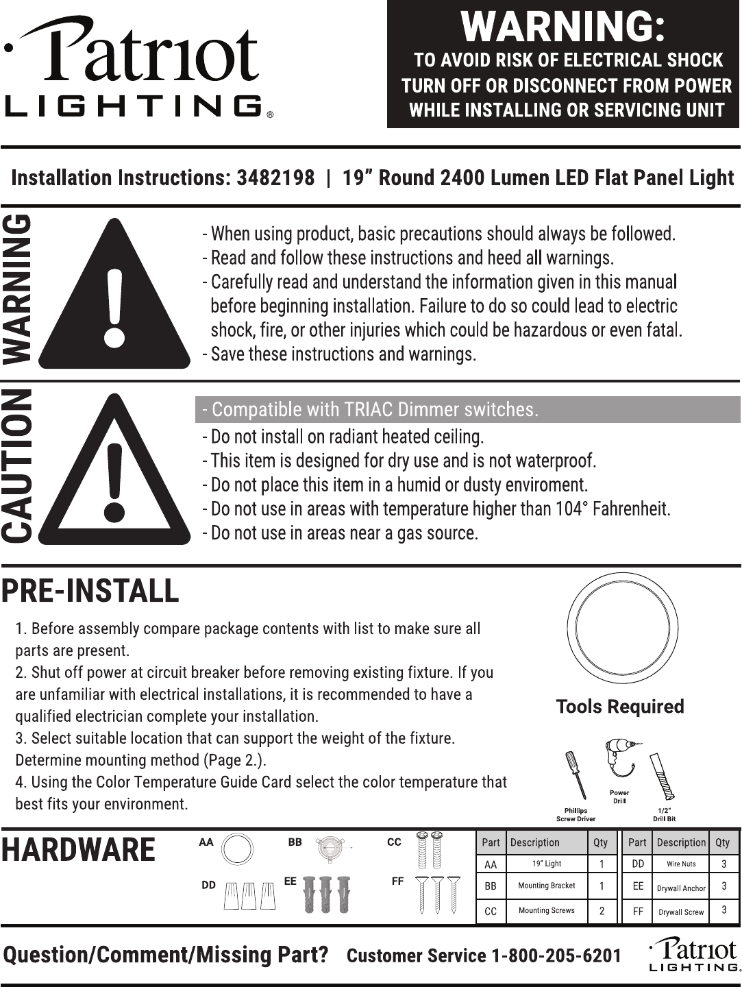 WARNING: 1 patriot TO AVOID RISK OF ELECTRICAL SHOCK TURN OFF OR DISCONNECT FROM POWER LIGHTING. WHILE INSTALLING OR SERVICING UNIT Installation Instructions: 3482198 | 19” Round 2400 Lumen LED Flat Panel Light When using product, basic precautions should always be followed. Read and follow these instructions and heed all warnings. Carefully read and understand the information given in this manual before beginning installation.
