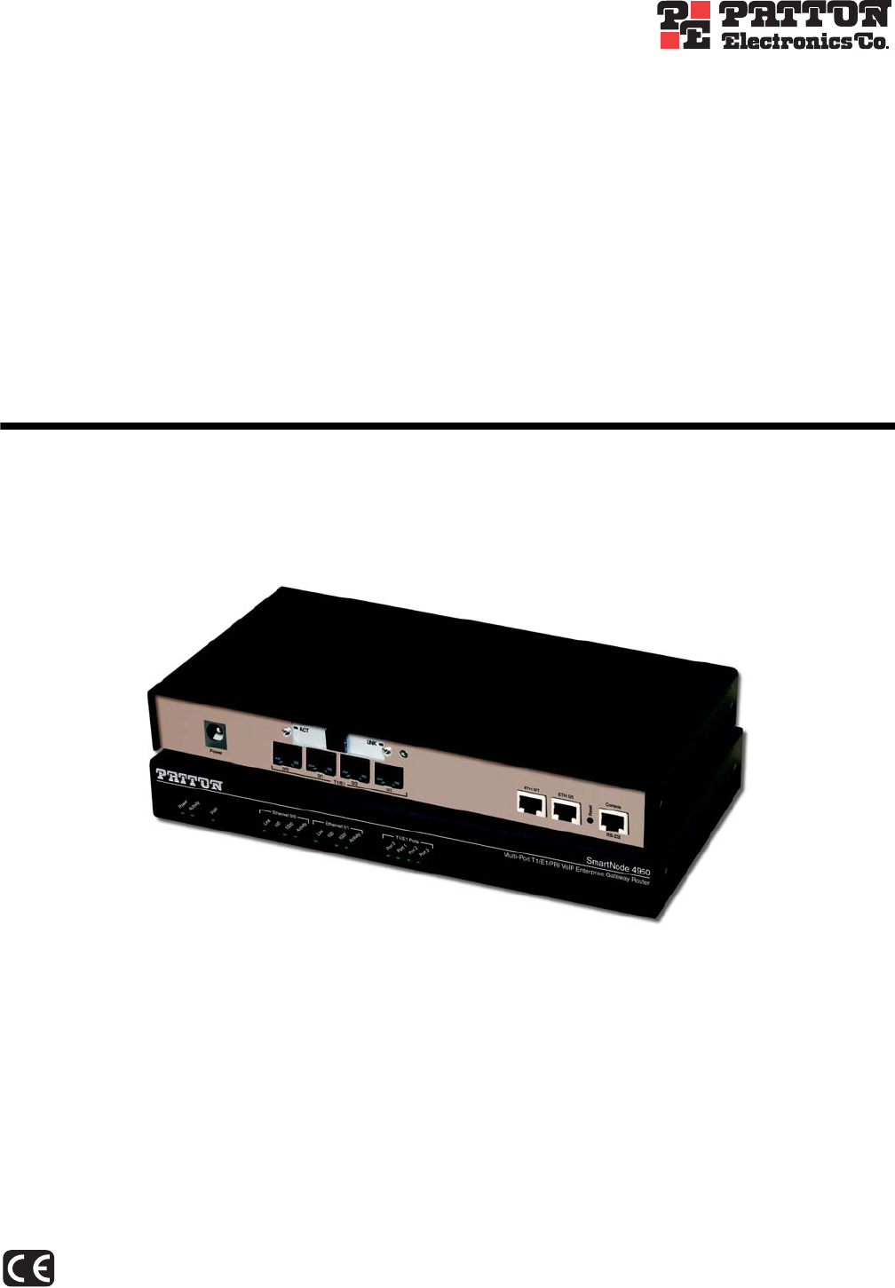 For Quick Start Installation SmartNode 4950-NCE Series Multi-Port T1/E1/PRI VoIP Enterprise Gateway Router Getting Started Guide Sales Office: +1 (301) 975-1000 Technical Support: +1 (301) 975-1007 E-mail: support@patton.com WWW: www.patton.com Part Number: 07MSN4950-NCE-GS, Rev.
