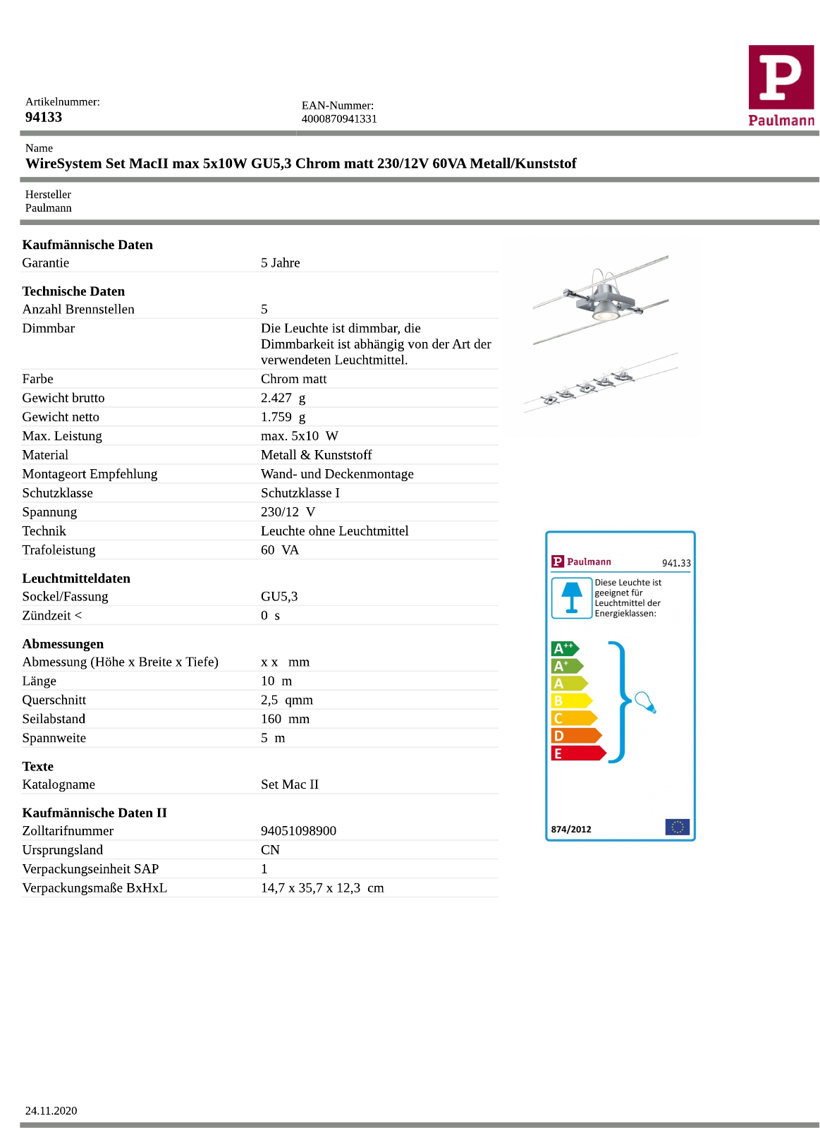 Artikelnummer: 94133 RAN-Nummer: 4000870941331 Name Filesystem Set Mali max 5x10W GU5,3 Chrom matt 230/12V 60VA Metall’Kunststof Kaufmännische Daten Garantie Technische Daten Anzahl Brennstellen Dimmbar Farbe Gewicht brutto Gewicht netto Marx.