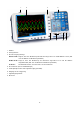 1. 2. 3. 4. 8. 7. 6. 5. Fig. 1 1. Power on/off 2. Display area 3. Power indication light Green light: Indicating Oscilloscope connects with AC Power, and the battery is in full (if there is battery inside Oscilloscope). Yellow light: Indicating Oscilloscope connect with AC Power and the battery is in charging (if there is battery inside Oscilloscope). Dim: Only powered by battery without connecting AC Power. 4. Control (key and knob) area 5.