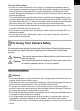 2 • Do not place your finger over the flash when discharging the flash. You may burn yourself. • Do not cover the flash with clothing when discharging the flash. Discoloration may occur. • Some portions of the camera heat up during use. There is a risk of low temperature burns when holding such portions for long periods. • Should the monitor be damaged, be careful of glass fragments. Also, be careful not to allow the liquid crystal to get on your skin or in your eyes or mouth.