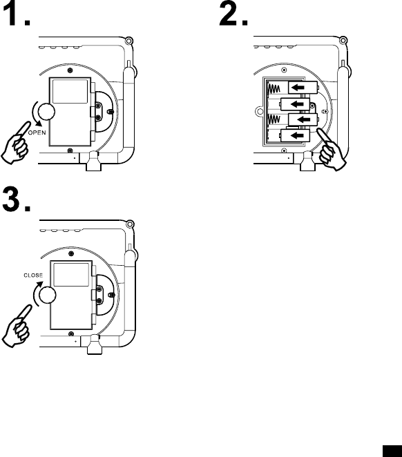1. Installera batterierna, först vrid batterilockets fixerare moturs för att