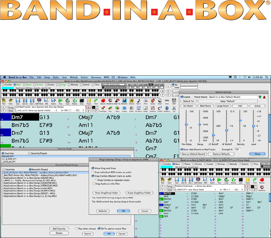 Chapter 1: Welcome to Band-in-a-Box! Congratulations on your purchase of Band-in-a-Box 2010.5 for Macintosh, the favorite of musicians, students, and songwriters everywhere. Get ready to have fun! What is Band-in-a-Box? Band-in-a-Box is an intelligent automatic accompaniment program for your multimedia computer. You can hear and play along to many song ideas and go from “nothing” to “something” in a very short period of time with Band-in-a-Box as your “on demand” backup band.