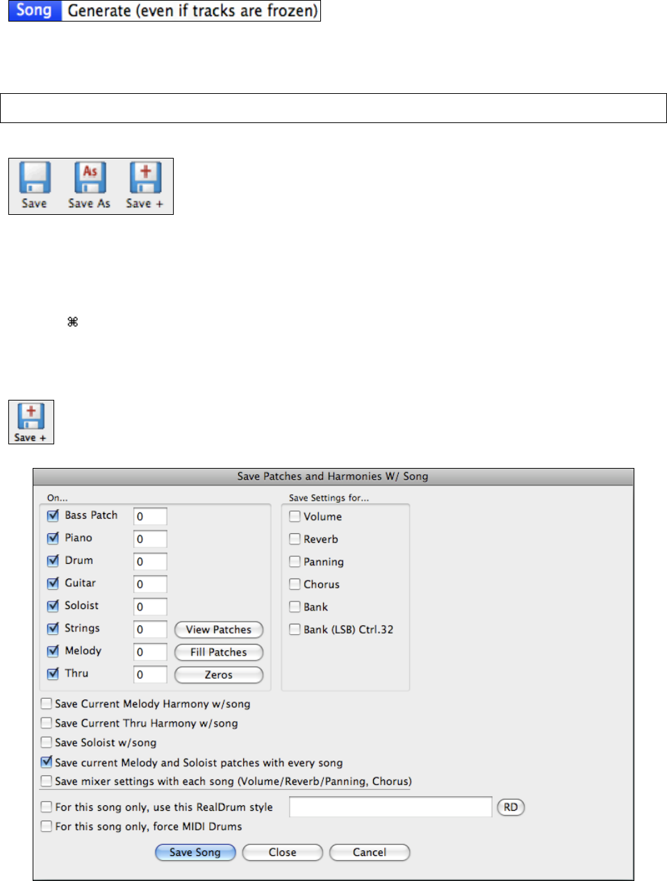 You can save your song with patches and other settings. This is done by selecting the [Save +] button or