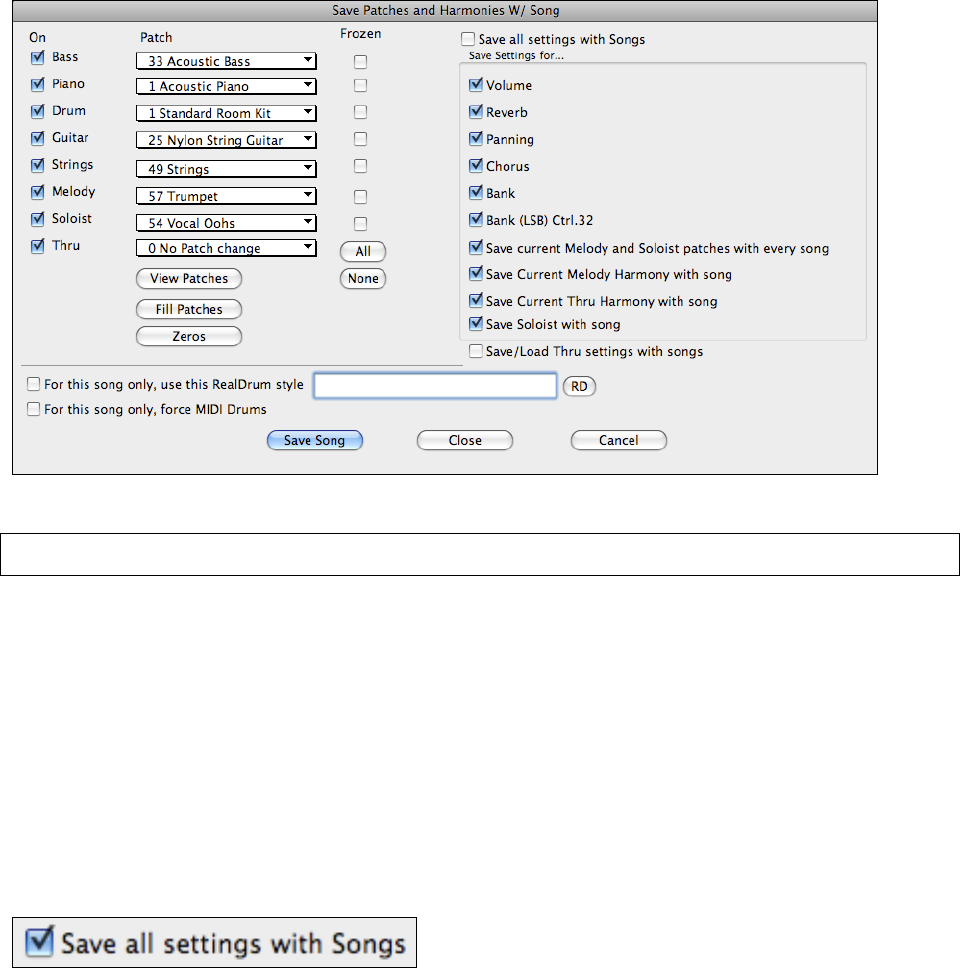 You can save all settings, including patches, by selecting “Save all settings with Songs.” Uncheck this box to