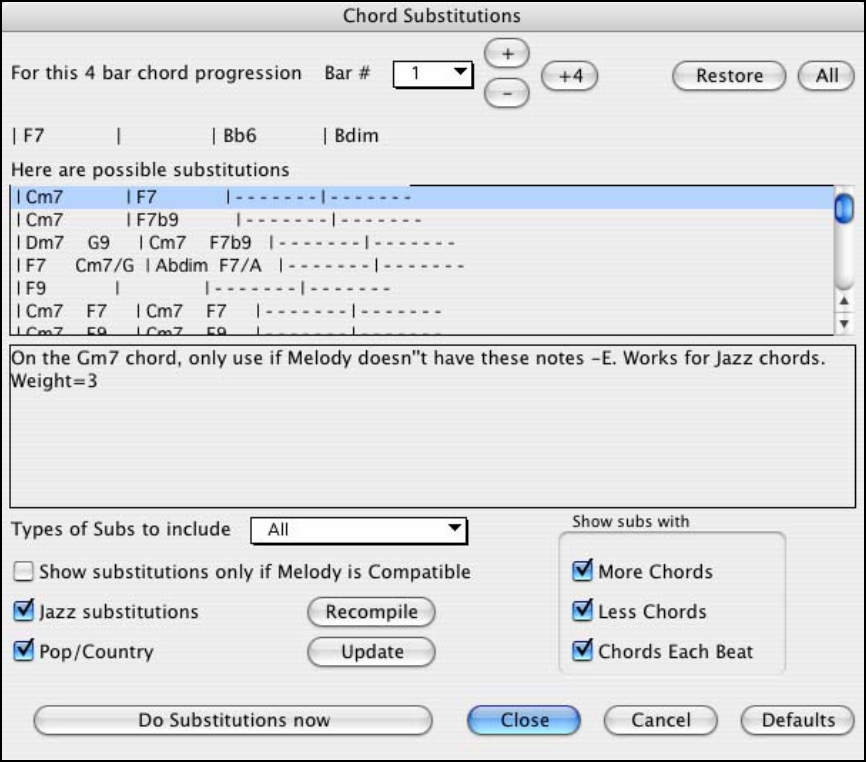in the dialog and may be changed. In the example above, the chord is an F7 chord, so the substitutions shown are