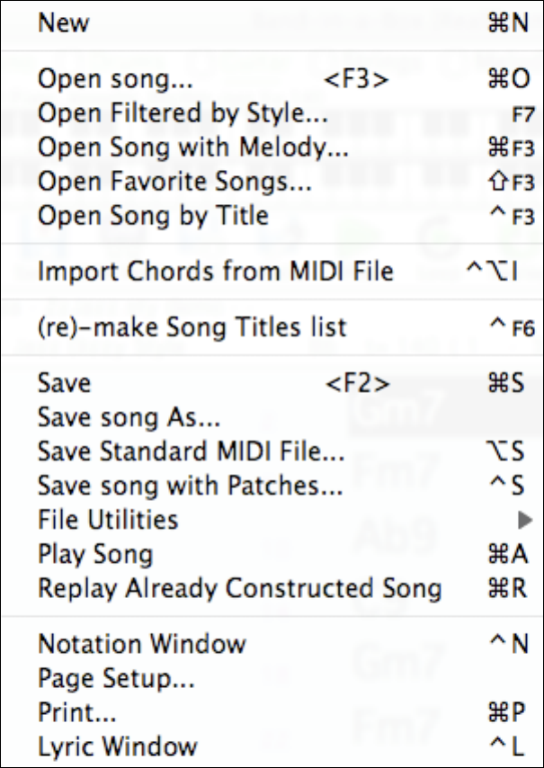 Open Song by Title opens the Song List with the full title, file name, and style of each song in the folder. A “Find”