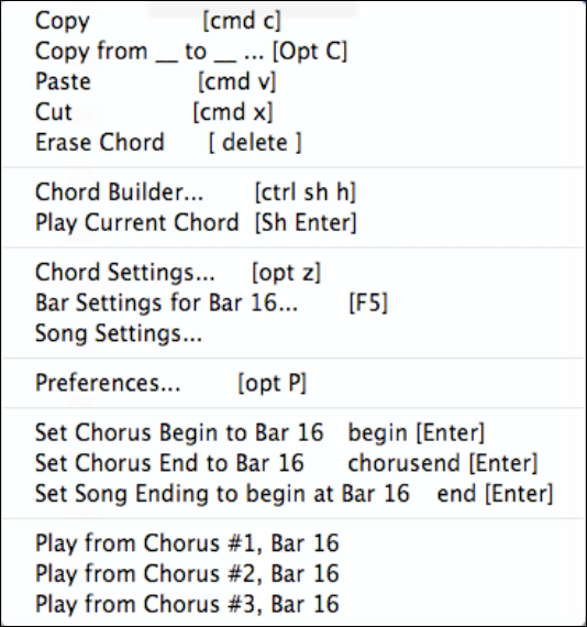 The chordsheet has a contextual menu that opens with Control+click or a right-click in the Chordsheet area. This