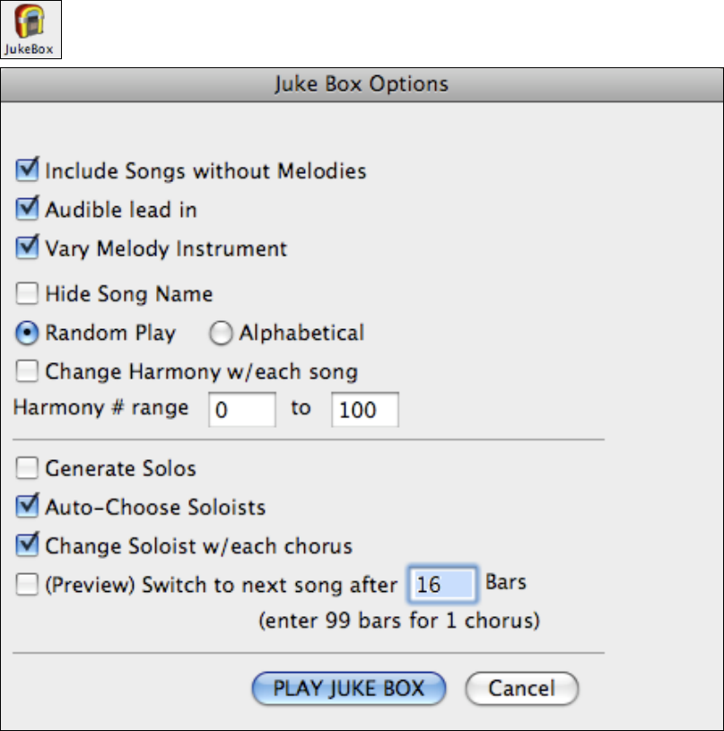 Jukebox for continuous playback of a list of Band-in-a-Box songs. Click the [JukeBox] button