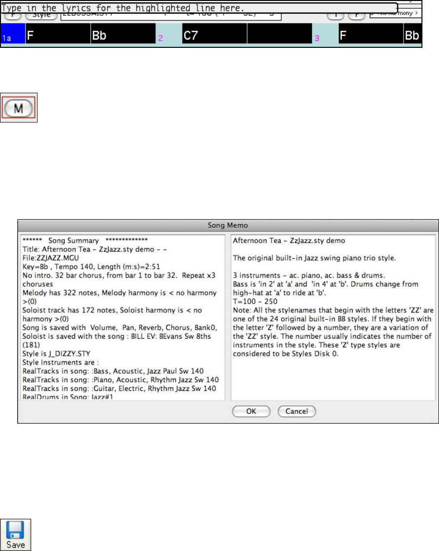 Song Memo dialog where you can type in a short memo about the song, style, etc.