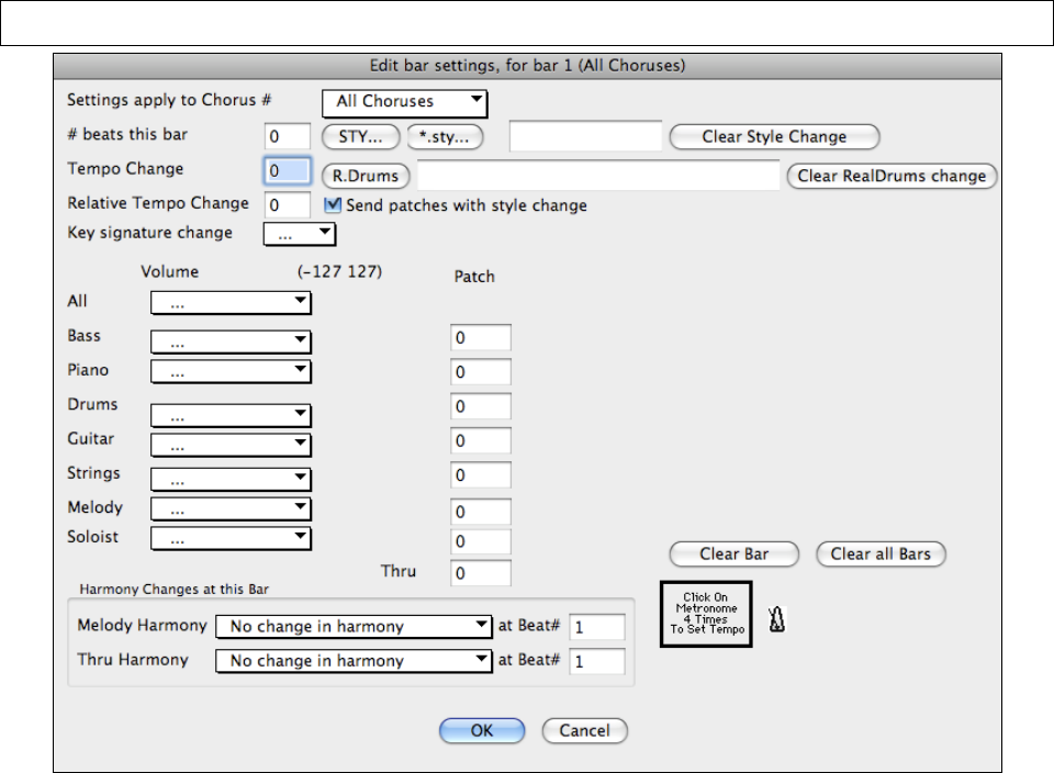 Bar settings let you change meter, tempo, styles, key, volume levels, patches, and harmonies at any bar. They are a
