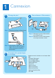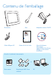 Contenu de l'emballage Pied Photoframe Adaptateur secteur CA/CC PhotoFrame 8FF3CDW 8FF3CME 10FF3CDW 10FF3CME 10FF3CMI Quick start guide 1 2 3 Connect Install Enjoy Eng Câble USB pour PC Guide de mise en route Manuel d'utilisation électronique Logiciel Philips PhotoFrame Manager et son manuel d'utilisation Autre matériel nécessaire ou AC Prise secteur Périphérique USB / Carte mémoire PC