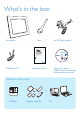 What’s in the box Stand Photoframe AC-DC Mains adaptor PhotoFrame 8FF3CDW 8FF3CME 10FF3CDW 10FF3CME 10FF3CMI Quick start guide 1 2 3 Connect Install Enjoy Eng USB cable to PC Quick Start Guide Digital User Manual Philips PhotoFrame Manager software and user manual What you also need or AC AC Mains Memory card/USB PC