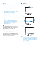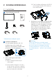 2. Installera bildskärmen (3) Fäst försiktigt ställningen till VESA monteringsområdet tills hakarna låser ställningen. 2.1 Installation Förpackningens innehåll 2 3 Quick start 1 32M1C5200W Register your product and get support at www.philips.com/welcome *Earphone-Hang 3. När basen monteras så använd båda händerna för att ställa bildskärmen upprätt, med ett fast grepp om både styrenplasten och bildskärmen. Du kan nu dra av styrenplasten.