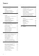 Saturs 1 2 3 4 5 LV Lietošanas sākšana 3 Televizora apskats Svarīgi Televizora novietošana Svarīgākais par izstrādājumu Iegūt plašāku informāciju 3 8 12 13 14 Televizora izmantošana 15 Pārskats Vadības taustiņi un indikatori sānos Tālvadības pults Televizora galvenās izvēlnes Televizora lietošana Pievienotās ierīces skatīšana Ambilight izmantošana Net TV izmantošana 15 15 15 17 19 21 22 23 6 7 Plašāka televizora izmantošana 29 Teleteksta izmantošana Iecienītie kanāli EPG izmantošana Taimeru