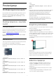 Razina prezentacije teleteksta Ulazi Ako je dostupna, razina 2.5 pruža više boja i bolju grafiku. Promijenite naziv ulaza i podesite postavke za Consumer Electronic Control (CEC). Prebacivanje između razine 2.5 i razine 1.5. . . 1 - Odaberite MENU > Opcije televizora > Napredne opcije > Teletekst > Razina prezentacije teleteksta i pritisnite OK. 2 - Odaberite razinu iz izbornika Razina prezentacije teleteksta i pritisnite OK kako biste je postavili.