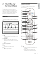 Congratulations on your purchase, and welcome to Philips! To fully benefit from the support that Philips offers(e.g. notification of product software upgrade), register your product at www.philips.com/welcome. Main unit This section includes an overview of the main unit. Remote control English 2 Your Blu-ray Surround Base This section includes an overview of the remote control. a b c d x e w f g a b c d e h v i j k l m u t n s o a Switch the Blu-ray Surround Base on or to standby.