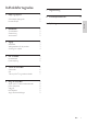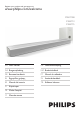 1 2 3 4 5 6 Hjælp og support 2 Ofte stillede spørgsmål Kontakt Philips 2 2 Meddelelse 2 2 2 2 Vigtigt 3 3 3 4 Din SoundBar 4 4 5 Tilslut din SoundBar 6 6 6 7 Brug din SoundBar 8 8 8 8 9 9 Overholdelse Strømsikring Varemærker Sikkerhed Vedligeholdelse af dit produkt Omsorg for miljøet Hovedenhed Fjernbetjening Subwoofer Stik Tilslut lyd fra TV og andre enheder Afspil lyd fra TV eller andre enheder Juster lydstyrken Vælg lyd MP3-afspiller Angiv fabriksindstillinger 7 Vægmontering 8