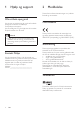 1 Hjælp og support 2 Meddelelse Dette afsnit omfatter bemærkninger om juridiske forhold og varemærker. Ofte stillede spørgsmål Hvis du har et problem, kan du se de ofte stillede spørgsmål om denne SoundBar på www.philips.com/support. Hvis du stadig har brug for hjælp, kan du kontakte Philips Kundeservice i dit land. Advarsel •• Forsøg ikke selv at reparere SoundBar. Dette medfører risiko for alvorlig personskade eller uoprettelige skader på SoundBar og bortfald af garantien.