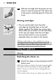 EESTI 59 Kassettide vahetamine Ärge visake pumpa minema, kui asendate tühja kasseti uuega. Pumpa läheb teil veel teiste kassettide jaoks vaja 2 1 C 1 Vajutage vabastusnuppu ja avage kassetipesa kaas. 2 Eemaldage tühi kassett ja tõmmake pump välja. C 3 Lükake pump uude kassetti, kuni kostab klõpsatus. C 4 Libistage kassett pardlisse. Kui pumba valge serv on ülespoole, mahub kassett täpselt pardlisse. Sulgege kaas.