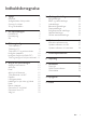 Indholdsfortegnelse 1 Vigtigt 2 2 3 3 3 2 Din hjemmebiograf 4 4 5 6 Sikkerhed Vedligeholdelse af dit produkt Omsorg for miljøet 3D og sundhedsfare Hovedenhed Fjernbetjening Stik 3 Tilslut og konfigurer 7 Tilslut højttalere 7 Tilslutning til TV 8 Tilslut lyd fra TV og andre enheder 9 Konfigurer højttalere 10 Konfigurer EasyLink (HDMI-CEC) 10 Tilslut og konfigurer et hjemmenetværk 11 4 Brug af din hjemmebiograf Adgang til startmenuen Auto play Diske Afspil lyd via Bluetooth Tilslut Bluetooth via NFC