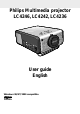 Philips Multimedia projector LC4246, LC4242, LC4236 On/Of f Vide o Menu Data AVMu te Standb y Mute Lamp Volum e OK Video S-Vid eo in Video in Data USB in L Aud io R Audio Powe r USB ou t Data in Audio out User guide English Windows 98/NT/2000 compatible RC