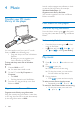 6 Recordings Record from the FM radio 1 2 Record audio/voices 1 2 From the Home screen, select . » The recording screen is displayed. Make sure that the microphone is close to the sound source to be recorded. 3 4 Tune in to a radio station. On the radio play screen, press and hold . Then, press / and to select [Record]. » You start recording from the FM radio. Press to record or pause. Press to save the recording. » Recordings are saved on the player.
