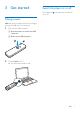 3 Get started Switch the player on or off Press and hold on or off. until the player is switched Charge power MINI has a built-in battery that can be charged through the USB port of a computer. 1 Slide out the USB connector: a Press the button to unlock the USB connector. b Slide out the USB connector. 1 2 2 Connect MINI to a PC » You enter the transfer mode.