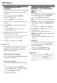 CD Player Programming track numbers Different play modes: REPEAT. and SHUFFLE (See 6, 7) You may store up to 20 tracks in the desired sequence. If you like, store any track more than once. 1 2 3 In the stop position, press PROG to activate programming. REPEAT You can play the current track or the whole disc repeatedly, and combine REPEAT modes with PROG (PROGRAM). ÜÜDisplay: PROG and 00 flash. (See 5) REP – plays the current track continuously. Press ∞ or § to select your desired track number.