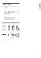 1 2 E rëndësishme 2 Ndihmë dhe mbështetje 2 Ndezja dhe fikja 12 Siguria 2 Zgjedhja e modaliteteve 12 Kujdesi për produktin 3 Zgjidhni efektin e ekualizuesit (EQ) 12 Kujdesi për mjedisin 3 Ndryshimi i volumit 13 Paralajmërimi FCC dhe deklarata IC Punimi me Bluetooth 13 për përdoruesit (vetëm SHBA dhe Punimi me AUX / OPTICAL / HDMI ARC 14 Kanada) 4 Pajtueshmëria 4 Çfarë ka në kuti 5 Soundbar juaj 6 Aparati 6 Konektorët 6 Subwoofer me valë 7 Telekomanda 7 Përgatitja e t