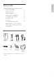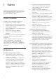 1 Važno 2 4 Korišćenje zvučnika Soundbar Pomoć i podrška 2 Uključivanje i isključivanje 12 Bezbjednost 2 Odaberite režime 12 Održavajte svoj aparat 3 Odaberite efekt ekvilajzera (EQ) 12 Briga o životnoj sredini 3 Podesite jačinu zvuka 13 Rad putem bluetootha 13 Oprez FCC i IC izjava za korisnike (samo SAD i Kanada) 2 4 12 Rad putem AUX / OPTICAL / Usklađenost 4 Šta je u kutiji 5 Rad putem USB-a 14 Vaš zvučnik Soundbar 6 5 Postavljanje na zid 15 Glavna jedinica 6 Priklj