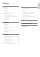 1 4 Käytä Soundbariasi Tärkeää 2 Ohje ja tuki 2 Kytke ON- ja OFF-tila 12 Turvallisuus 2 Valitse tilat 12 Tuotteesi huolto, 3 Valittse taajuuskorjaimen (EQ) efekti 12 Ympäristöstä huolehtiminen 3 Äänenvoimakkuuden säätö 13 Bluetooth-käyttö 13 AUX / OPTICAL / HDMI ARC -käyttö 14 USB:n käyttö 14 5 Seinäkiinnitys 15 6 Tuotteen tekniset tiedot 16 7 17 Varoitus FCC ja IC -lausunto käyttäjiä varten (vain USA ja Kanada) 4 2 Finnish Sisällys Noudatettavuus 4 Laatikon sisältö 5