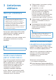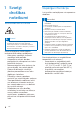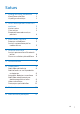 Saturs 1 Svarīgi drošības noteikumi 2 Klausīšanas drošība Vispārīga informācija 2 2 2 Ausīs ievietojamās Bluetooth austiņas 3 Kastes saturs Citas ierīces Bluetooth bezvadu austiņu pārskats 3 Lietošanas sākšana Baterijas uzlādēšana Austiņu savienošana pārī ar mobilo tālruni 4 Austiņu lietošana 3 3 4 5 5 5 6 Austiņu pievienošana Bluetooth ierīcei 6 Zvanu un mūzikas pārvaldīšana 6 5 Tehniskie dati 8 6 Paziņojums 9 Atbilstības deklarācija 9 Atbrīvošanās no vecā produkta un baterijas 9 Integrētās