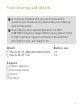 What to do Change battery (chapter 5) Clean earpiece (chapter 14) Insert battery correctly (chapter 5) Switch hearing aid on by completely closing battery door (chapter 4) Insert hearing aid correctly (chapter 6) Contact your hearing care professional Decrease volume if volume control available (chapter 8) Change battery (chapter 5) Clean earpiece (chapter 14) Turn volume up if volume control available (chapter 8) Contact you hearing care professional Change battery within the next 30 minutes (chapter 5) Wi