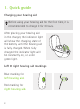 1. Quick guide Charging your hearing aid Before using your hearing aid for the first time, it is recommended to charge it for 3 hours. After placing your hearing aid in the charger, the indicator light will show the charging state of the battery until the hearing aid is fully charged. When fully charged the indicator light will be constantly on, i.e. solid green light. Left & right hearing aid markings Blue marking for left hearing aid. Red marking for right hearing aid.