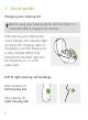 1. Quick guide Charging your hearing aid Before using your hearing aid for the first time, it is recommended to charge it for 3 hours. After placing your hearing aid in the charger, the indicator light will show the charging state of the battery until the hearing aid is fully charged. When fully charged the indicator light will be constantly on, i.e. solid green light. Left & right hearing aid markings Blue marking for left hearing aid. Red marking for right hearing aid.