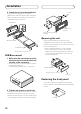 Installation Remarque Tableau de bord Laissez un espace Français • Vérifiez toutes les connexions et tous les systèmes avant l’installation finale. • N’utilisez aucune pièce non autorisée. L’utilisation de pièces non autorisées peut causer un mauvais fonctionnement. • Consultez votre revendeur si l’installation nécessite que vous perciez des trous ou effectuiez d’autres modifications du véhicule. • N’installez pas l’appareil dans un endroit où: — il peut gêner la conduite du véhicule.