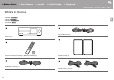 > Before Start > Part Names > Install > Initial Setup > Playback Advanced Setup | Firmware Update | Others What's in the box Before Start X-HM76D : 12356 X-HM76 : 12456 X-HM86D : 123567 XC-HM86D : 123 E N Indoor FM antenna (1) Main unit (1) Remote controller (RC-945S) (1), Batteries (AAA/R03) (2) Speaker system (2) DAB/FM wire antenna (1) Speaker cable (1.